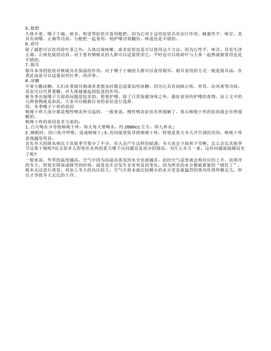 一、冬季嗓子干疼怎么办1、戒烟酒要做到戒烟限酒,因为烟酒都是刺激性的东西,容易对咽喉有损伤,所以要想避免嗓子发干,首先要做到不抽烟喝酒。2、忌辛辣不要吃辣椒、大蒜等辛辣的食物,也不要吃麻辣烫、火锅等辛辣刺激的食物,这对嗓子发干都有潜在的催化作用。3、多喝水一天要保证喝6杯以上的水,喝的时候不要一口气喝完,要小口小口的喝,让喉咙得到水的滋润。4、含凉糖去超市或药店,买上一些凉糖或含片,放在身边,每过几个小时含在嘴里,使喉咙通过凉糖含片保持湿润。5、胖大海如果嗓子干的严重影响说话的话,可以去药店买一些胖大海泡水喝,一天一颗泡水喝非常管用。6、吃水果多吃一些马蹄(荸荠)、鸭梨等水分多的凉性水果,可以起到润喉的作用。7、盐水漱口用食盐泡凉开水,早上起床和晚上睡前各泡一次漱口,对防止嗓子发干也有很好的效果。8、梨子1.洗干净后直接吃。2.把梨子榨成汁,在梨汁里加入白糖。3.把梨子削成块加入冰糖放在锅里煮。以上三种吃法都可以,梨子有降火润补的作用。9、增加室内的湿度有些人在睡着的时候喜欢张着嘴巴呼吸,醒来的时候喉咙难免会干疼。如果在房间里使用加湿器,使室内的湿度增加,这样周围的空气会湿润一点。10、枕枕头如果你老是在睡醒的时候嗓子干疼,很可能是因为枕头枕的太低了,胃酸逆流,酸又刺激喉咙,所以在睡觉的时候要适当把枕头垫高一点。11、鸡蛋加白糖打两个鸡蛋在碗中,加入白糖,尽量多放一点,去鸡蛋腥味。用筷子搅开,喝下去,去火滋润,很有用。二、冬季嗓子干疼如何预防少开空调开着空调,关门关窗,空气不流通,屋里的空气质量肯定很差,也很容易滋生细菌。加上空调吸水,室内空气干燥,对呼吸道内黏膜保湿不好。多喝水冬天空气干燥,人失水更快。需要经常喝水来补充身体的水分。少吃冷饮都知道冷饮吃多了孩子容易生病。一是冷饮不卫生,二是冷饮过凉,孩子一冷一热,容易刺激孩子肠胃和呼吸道。开空调时室内要洒水空调制冷时要吸收室内空气中的水分,所以空调间里空气都很干燥,长期待在空调室内,呼吸道,包括嗓子内黏膜,会因为失水而出现干疼现象。需要在屋里放一盆水或者洒水来缓解室内干燥问题。经常洗手,养成卫生习惯孩子总有把手放在嘴里的习惯,手放在嘴里,大量细菌会直接进入我们的身体,当然也要经过我们的嗓子。引起细菌感染。小孩子要养成不吃手和经常洗手的好习惯。每天到户外运动一段时间冬季气温降低,可以到或外运动或者散步一会,呼吸新鲜空气,提高人体免疫力。三、保护嗓的食物有哪些1.金银花清热解毒、治感冒等可以适量用些金银花泡水喝,除此之外还可以将它用于护嗓子,如果因为感冒引起的嗓子疼痛可以使用该方法,因为它可杀灭病菌从而缓解嗓子疼痛。2.金桔人出现咳嗽咳、痰多、嗓子疼痛、感冒等症状时可以适量食用些金桔,因为它对其具有治疗的效果。对于不是很喜欢金桔的人群可以将其制作成蜜饯食用也是相当不错的。3.梨润肺、生津止渴、护嗓是梨的功效,如果嗓子总是出现干燥、疼痛,可以将梨放入加有适量水的锅中进行熬煮成汤再食用即可,或者在煮汤期间加些川贝,其润嗓效果翻倍。4.罗汉果从事教师、播音等说话时间较长的人群,可以经常饮用罗汉果泡的水,因为它具有止咳润喉、清肺化痰等功效,对于患上慢性咽炎的人群可非常适合使用此方法。5.枇杷久咳不愈、嗓子干痛、痰多、呕逆等症状可食用枇杷,因为它对于这些症状具有治疗作用。蜂蜜性平、味甘,其具有润嗓、止痛等功效,与枇杷一起食用,则护嗓功效翻倍,味道也是不错的。6.荷叶除了减肥可以饮用荷叶茶之外,人体出现咳嗽、痰多症状也是可以使用这个方法,因为它性平,味苦,具有生津止渴、止咳化痰的功效,对于患有咽喉炎的人群可以适量饮用它,平时也可以将荷叶与大米一起熬成粥食用也是不错的。7.银耳银耳本身的胶质对喉咙具有保湿的作用,对于嗓子干痛的人群可以食用银耳。银耳食用的方式一般是银耳汤,在煮此汤是可以适量加些红枣、西洋参。8.冰糖不要小瞧冰糖,人们在煮银耳粥或者煮梨水时都会适量加些冰糖,因为它具有润肺止咳、养胃、治风寒等功效,其也可以代替果糖,对人体健康起到促进的作用。秋冬季出现嗓子方面的...