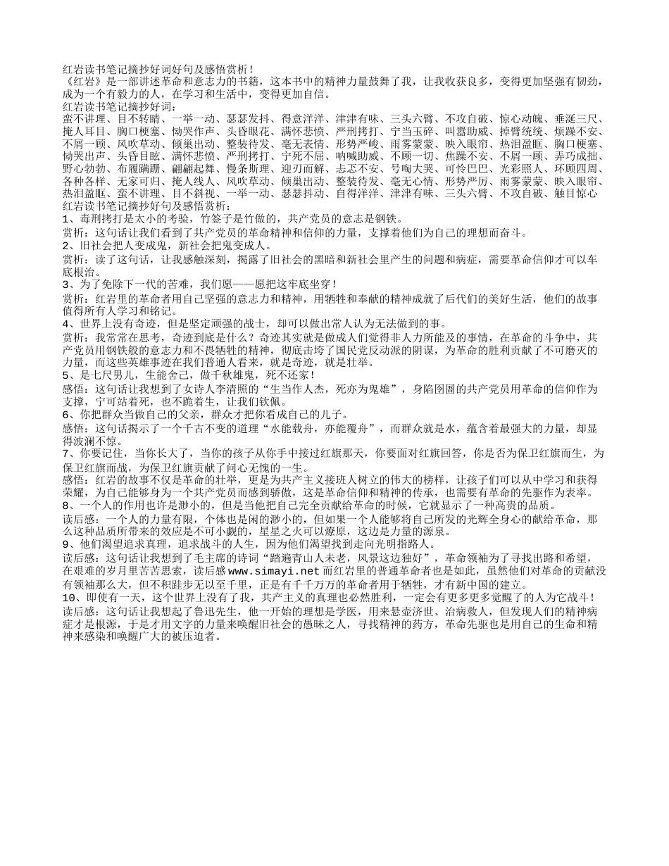 红岩读书笔记摘抄好词好句及感悟赏析!《红岩》是一部讲述革命和意志力的书籍,这本书中的精神力量鼓舞了我,让我收获良多,变得更加坚强有韧劲,成为一个有毅力的人,在学习和生活中,变得更加自信。红岩读书笔记摘抄好词:蛮不讲理、目不转睛、一举一动、瑟瑟发抖、得意洋洋、津津有味、三头六臂、不攻自破、惊心动魄、垂涎三尺、掩人耳目、胸口梗塞、恸哭作声、头昏眼花、满怀悲愤、严刑拷打、宁当玉碎、叫嚣助威、掉臂统统、烦躁不安、不屑一顾、风吹草动、倾巢出动、整装待发、毫无表情、形势严峻、雨雾蒙蒙、映入眼帘、热泪盈眶、胸口梗塞、恸哭出声、头昏目眩、满怀悲愤、严刑拷打、宁死不屈、呐喊助威、不顾一切、焦躁不安、不屑一顾、弄巧成拙、野心勃勃、布履蹒跚、翩翩起舞、慢条斯理、迎刃而解、忐忑不安、号啕大哭、可怜巴巴、光彩照人、环顾四周、各种各样、无家可归、掩人线人、风吹草动、倾巢出动、整装待发、毫无心情、形势严厉、雨雾蒙蒙、映入眼帘、热泪盈眶、蛮不讲理、目不斜视、一举一动、瑟瑟抖动、自得洋洋、津津有味、三头六臂、不攻自破、触目惊心红岩读书笔记摘抄好句及感悟赏析:1、毒刑拷打是太小的考验,竹签子是竹做的,共产党员的意志是钢铁。赏析:这句话让我们看到了共产党员的革命精神和信仰的力量,支撑着他们为自己的理想而奋斗。2、旧社会把人变成鬼,新社会把鬼变成人。赏析:读了这句话,让我感触深刻,揭露了旧社会的黑暗和新社会里产生的问题和病症,需要革命信仰才可以车底根治。3、为了免除下一代的苦难,我们愿——愿把这牢底坐穿!赏析:红岩里的革命者用自己坚强的意志力和精神,用牺牲和奉献的精神成就了后代们的美好生活,他们的故事值得所有人学习和铭记。4、世界上没有奇迹,但是坚定顽强的战士,却可以做出常人认为无法做到的事。赏析:我常常在思考,奇迹到底是什么?奇迹其实就是做成人们觉得非人力所能及的事情,在革命的斗争中,共产党员用钢铁般的意志力和不畏牺牲的精神,彻底击垮了国民党反动派的阴谋,为革命的胜利贡献了不可磨灭的力量,而这些英雄事迹在我们普通人看来,就是奇迹,就是壮举。5、是七尺男儿,生能舍己,做千秋雄鬼,死不还家!感悟:这句话让我想到了女诗人李清照的“生当作人杰,死亦为鬼雄”,身陷囹圄的共产党员用革命的信仰作为支撑,宁可站着死,也不跪着生,让我们钦佩。6、你把群众当做自己的父亲,群众才把你看成自己的儿子。感悟:这句话揭示了一个千古不变的道理“水能载舟,亦能覆舟”,而群众就是水,蕴含着最强大的力量,却显得波澜不惊。7、你要记住,当你长大了,当你的孩子从你手中接过红旗那天,你要面对红旗回答,你是否为保卫红旗而生,为保卫红旗而战,为保卫红旗贡献了问心无愧的一生。感悟:红岩的故事不仅是革命的壮举,更是为共产主义接班人树立的伟大的榜样,让孩子们可以从中学习和获得荣耀,为自己能够身为一个共产党员而感到骄傲,这是革命信仰和精神的传承,也需要有革命的先驱作为表率。8、一个人的作用也许是渺小的,但是当他把自己完全贡献给革命的时候,它就显示了一种高贵的品质。读后感:一个人的力量有限,个体也是闲的渺小的,但如果一个人能够将自己所发的光辉全身心的献给革命,那么这种品质所带来的效应是不可小觑的,星星之火可以燎原,这边是力量的源泉。9、他们渴望追求真理,追求战斗的人生,因为他们渴望找到走向光明指路人。读后感:这句话让我想到了毛主席的诗词“踏遍青山人未老,风景这边独好”,革命领袖为了寻找出路和希望,在艰难的岁月里苦苦思索,读后感www.simayi.net而红岩里的普通革命者也是如此,虽然他们对革命的贡献没有领袖那么大,但不积跬步无以至千里,正是有千千万万的革命者用于牺牲,才有新中国的建立。10、即使有一天,这个世界上没有了我,共产主义的真理也必然胜利,一定会有更多更多觉醒了的人为它战斗!读后感:这句话让我想起了鲁迅先生,他一开始的理想是学医,用来悬壶济世、治病救人,但发现人们的精神病症才是根源,于是才用文字的力量来唤醒旧社会的愚昧之人,寻找精神的药方,革命先驱也是用自己的生命和精神来感...